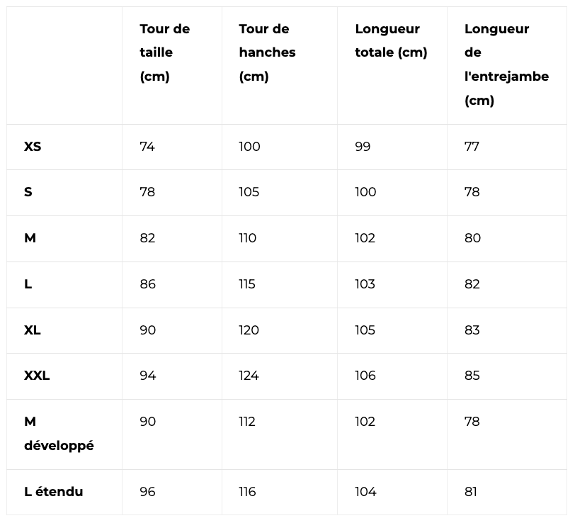 - L'extrémité des jambes du pantalon peut être élargie à l'aide d'une fermeture éclair avec une housse auto-agrippante