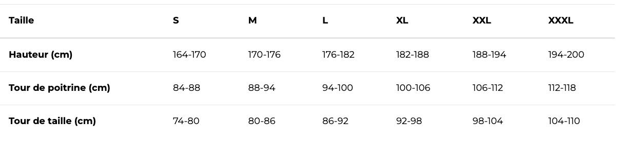 Guide des tailles pour le pantalon thermique pour hommes avec tissu technique sans couture pour la moto